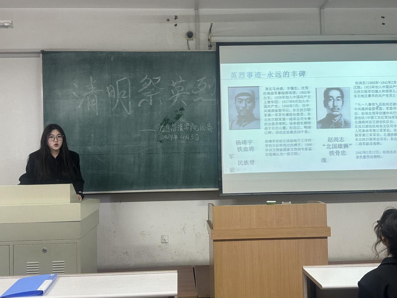 为引导广大团员和青年继承和弘扬老一辈革命家的优良传统,树立正确的世界观、人生观、价值观,厚植家国情怀,勇担时代使命。yl6776永利集团团委积极响应校团委号召,于4月3日下午1时30分在汇文楼353教室举办“清明祭英烈,共铸中华魂”清明节主题活动。yl6776永利集团团委学生组织部部长谭雨欣主持,学生团委副书记滕玉欣、部长团、干事以及2023级学生代表参加本次活动。