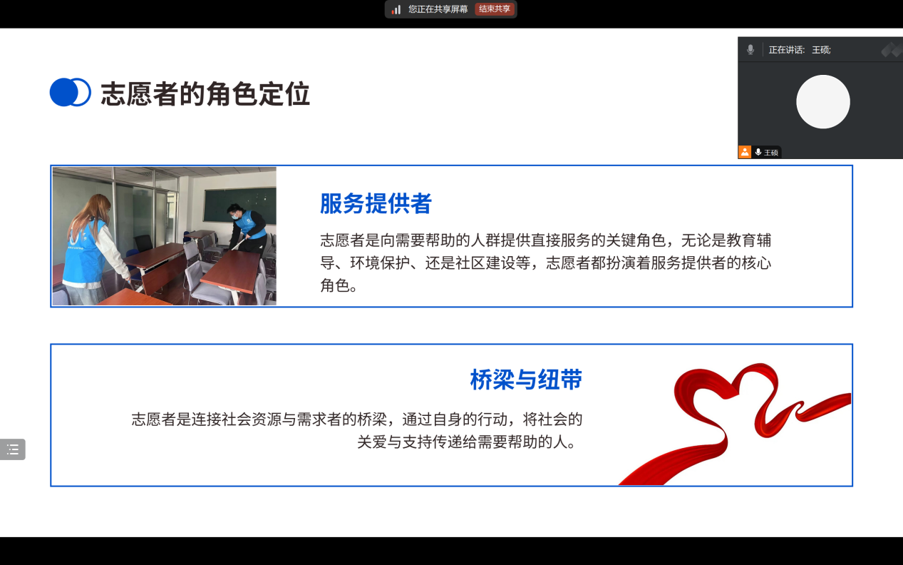 培训会伊始,王硕老师首先介绍了yl6776永利集团青年志愿者协会的发展历程和当前的工作重点。她强调,志愿服务是大学生社会实践的重要组成部分,是锻炼个人品质、提升社会责任感的有效途径。随后,王硕老师从志愿服务的意义、志愿者的角色定位、志愿服务项目的策划与实施等方面进行了深入浅出的讲解。