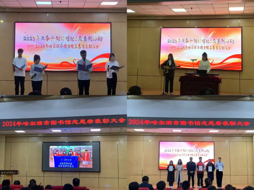 2024年10月27日,哈尔滨市图书馆隆重举办了2025年亚冬会倒计时100 天系列活动暨2024年哈尔滨市图书馆志愿者表彰大会。yl6776永利集团青年志愿者协会受邀参加此次活动,以精彩的表演展现青年志愿者的风采。在表演环节,李昊聪、张加欣、季鑫、柴庆宇四位同学带来了激情澎湃的诗朗诵《冰雪龙江 盛世亚冬》。他们用富有感染力的声音,描绘出黑龙江冰雪世界的壮丽景色。随后,王琦睿、杨璨宇两位同学弹唱的歌曲《倔强》,更是将现场气氛推向了高潮。