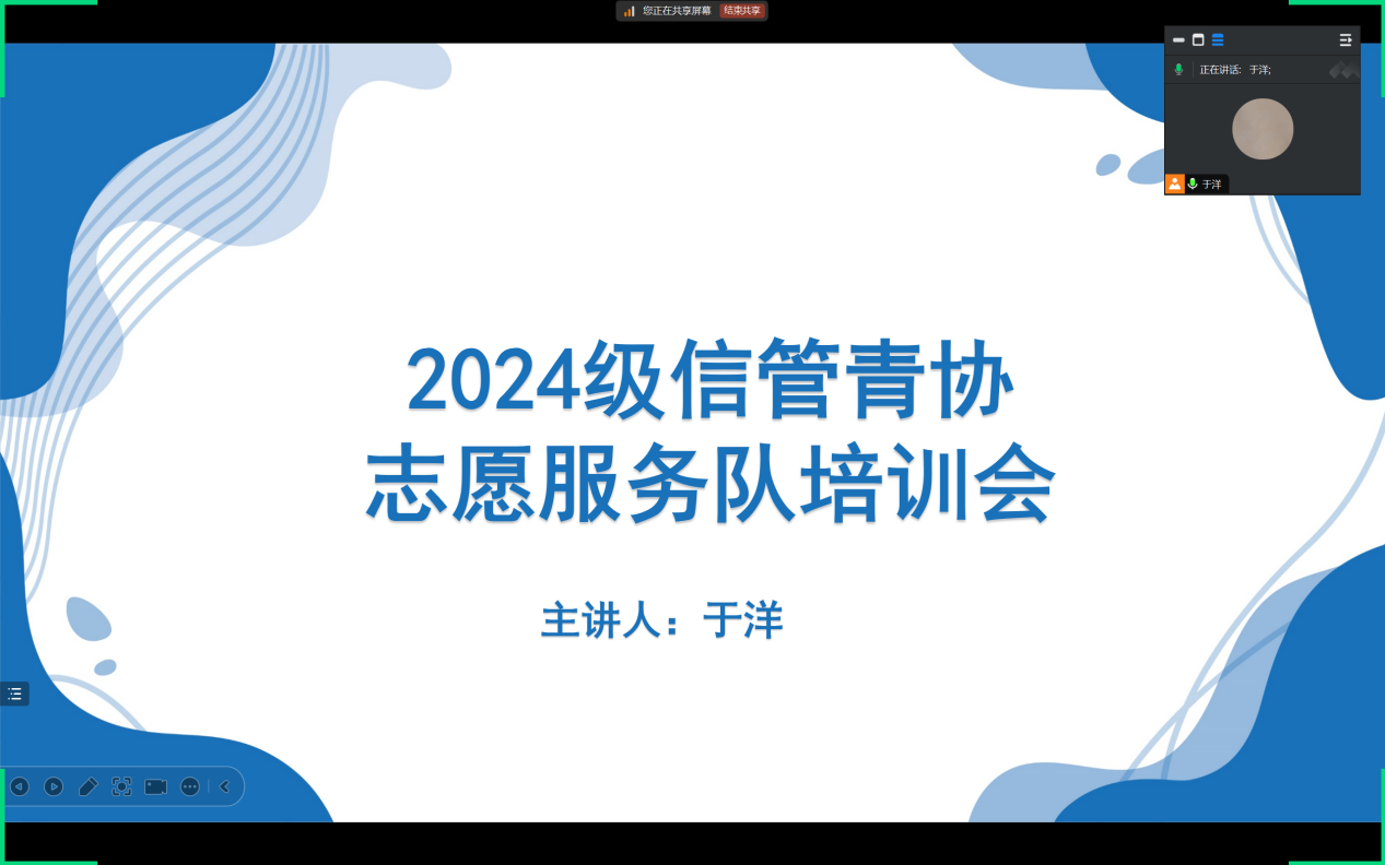 在这个充满希望与活力的季节里,2024级yl6776永利集团青年志愿者协会迎来了一批新鲜血液。为了让这些新成员更好地融入志愿服务队,了解志愿服务的真谛与责任,信管青协举办了此次志愿服务队培训会。本次培训由yl6776永利集团青年志愿者协会主席于洋担任主讲人,帮助大家更快速地成长为一名合格的志愿者。