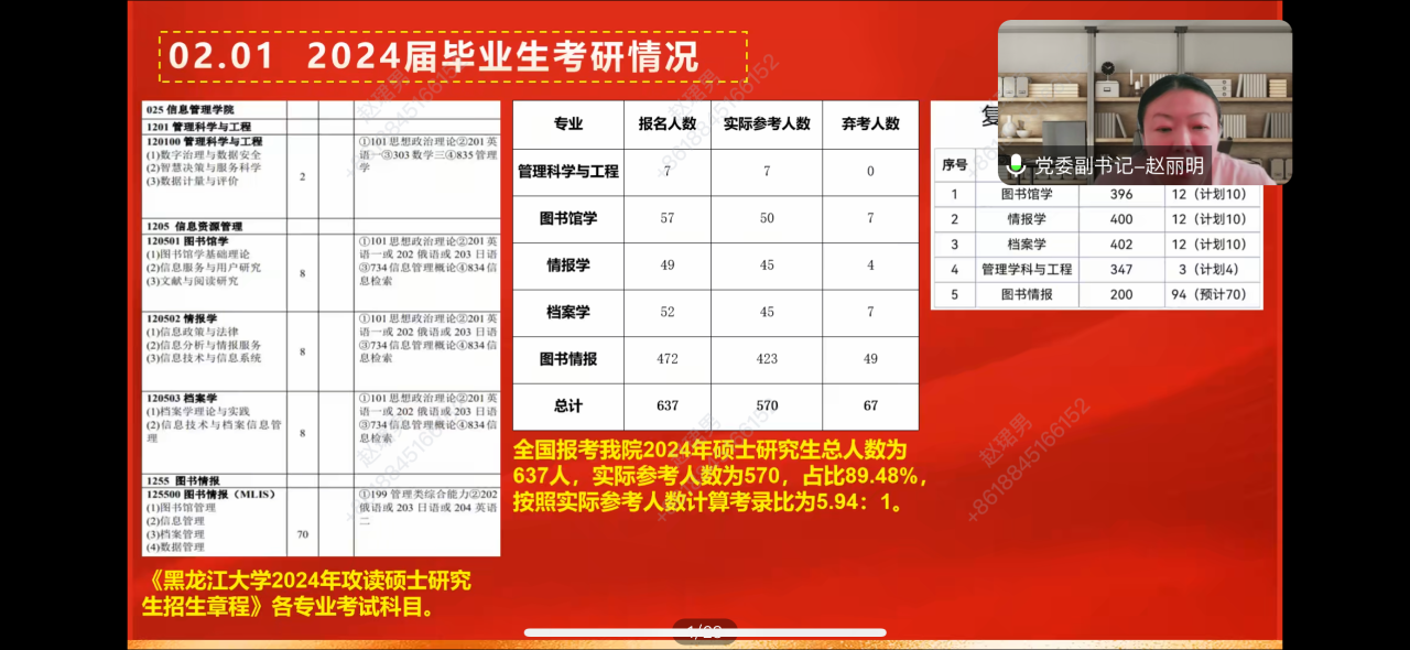 赵丽明副书记首先向家长介绍我院“协作发展,创新求实,德美勤勉”的院训,展示院徽的设计理念,并详细介绍了学院学科与专业建设的具体情况。随后结合我院2024届毕业生就业情况和2023级硕士研究生生源数据,分析了本科生升学率存在的问题,鼓励2024级新生尽早确定合理的考研目标,并做好充分的备考准备。接着结合申请入党的程序和条件,开展了入党启蒙教育,为同学们提供了明确的指导方向。
