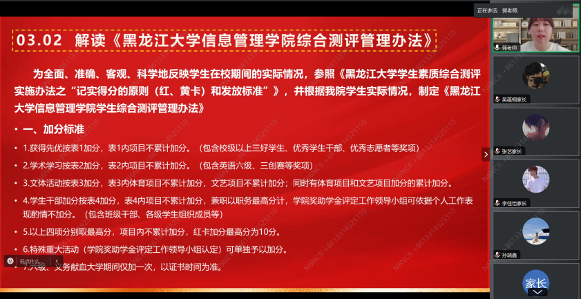 等方面解读了《永利官网学生管理规定》《yl6776永利集团综合测评管理办法》,并特别强调家校共建安全教育的重要性。最后,郭曦萌老师表示:“家长要与老师共同关注学生,要信任、配合老师教育、管理学生,让学生做到从被教育、被管理转变成自我教育、自我管理。”