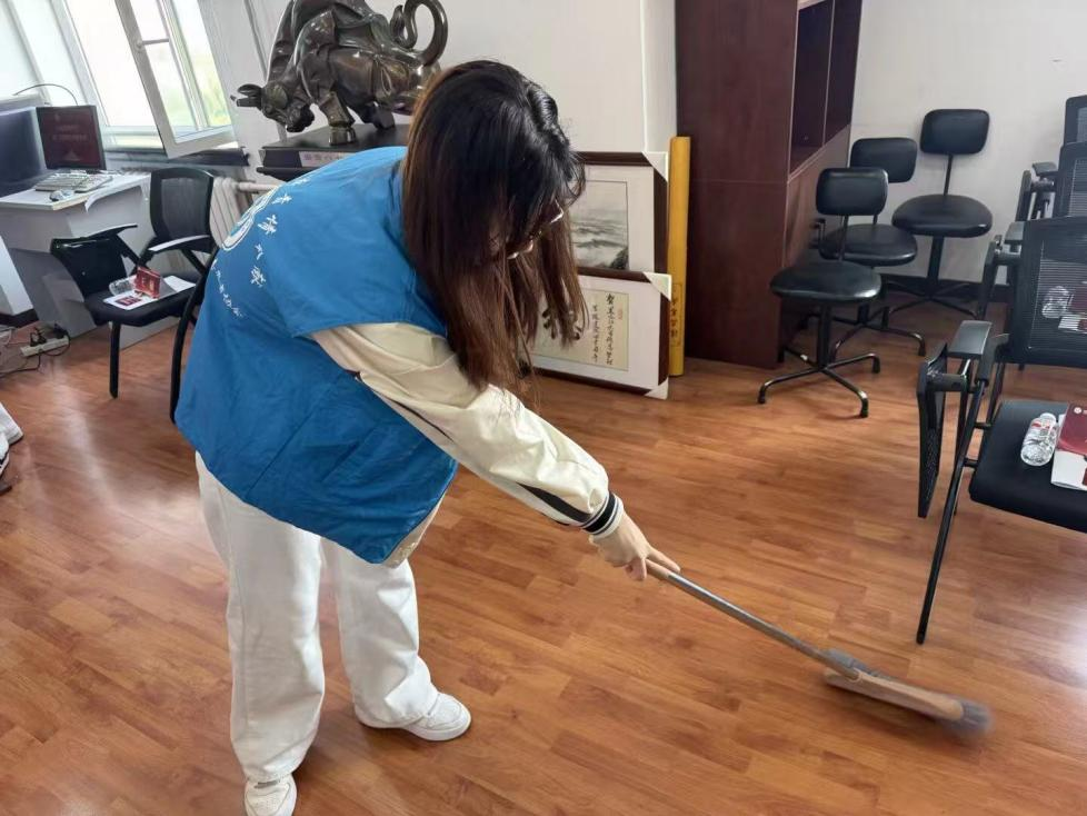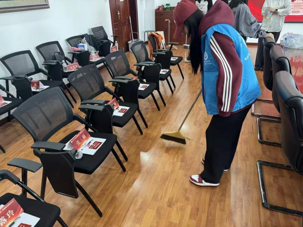 活动现场,志愿者们分工明确,各司其职,大家细致擦拭会议桌椅、墙面挂件与玻璃门窗,将桌椅摆放整齐;对地面缝隙、墙角积尘等卫生死角进行深度清理,不放过任何一处角落。经过大家的共同努力,会议室窗明几净、物品规整,整体环境焕然一新,为师生后续开展会议、交流研讨提供了良好保障。