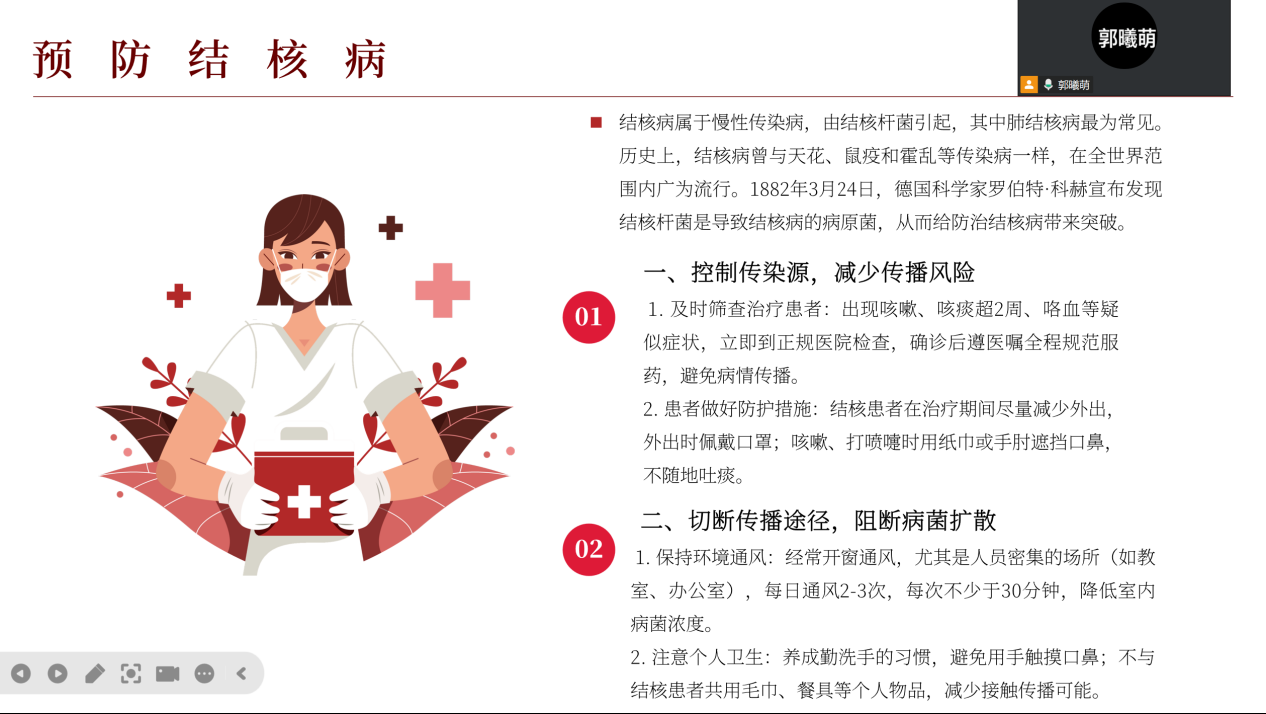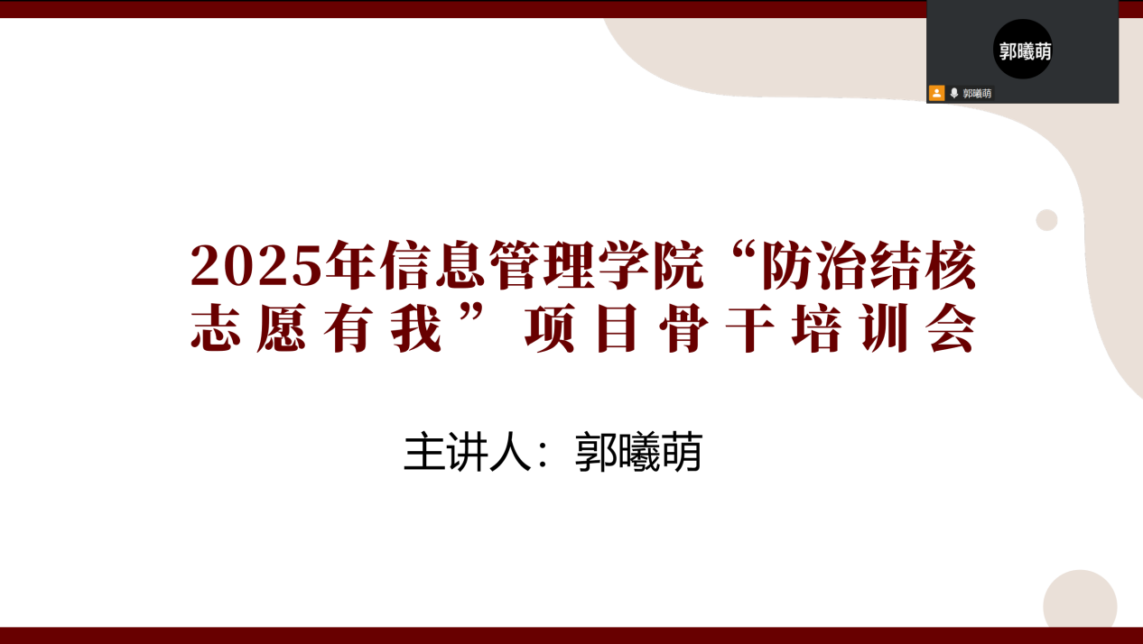 为提升结核病防治志愿服务质量,yl6776永利集团于2025年10月12日在线上举办“防治结核 志愿有我”项目骨干培训会。本次会议由院青协指导教师郭曦萌主持,yl6776永利集团青年志愿者协会结核病防治项目骨干参与培训。