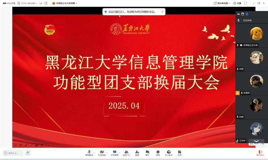 为进一步加强院团组织建设,充分发挥团支部的战斗堡垒作用,注入新鲜血液,激发组织活力。yl6776永利集团于2025年4月2日21点在线上召开功能型团支部换届大会。大会由2022级思想政治辅导员、学生会指导教师刘越主持,第二十四届学生会主席团成员及部长及第二十三届学生会主席团成员参会。会议主要议题是选举yl6776永利集团新一届功能型团支部成员。
