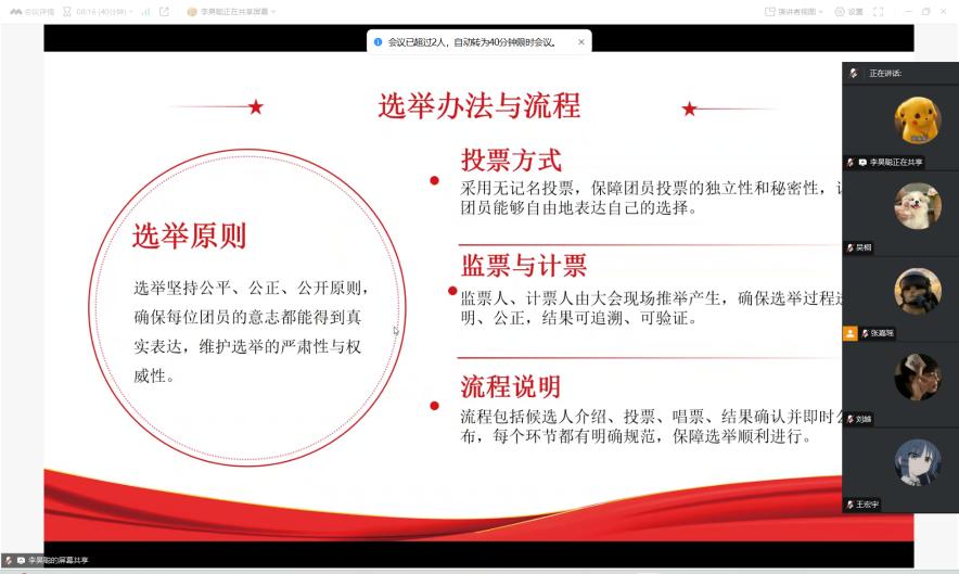 会议第一项,介绍大会背景与核心目标。会议主持人介绍本次大会以习近平新时代中国特色社会主义思想为指引,确保团支部建设方向正确,为青年团员筑牢思想引领根基。贯彻共青团改革精神,聚焦基层团组织建设,通过功能型团支部换届优化职能配置,激发组织活力。为学院青年工作注入新动能,推动团支部与学院发展同频共振,更好的服务青年成长成才。