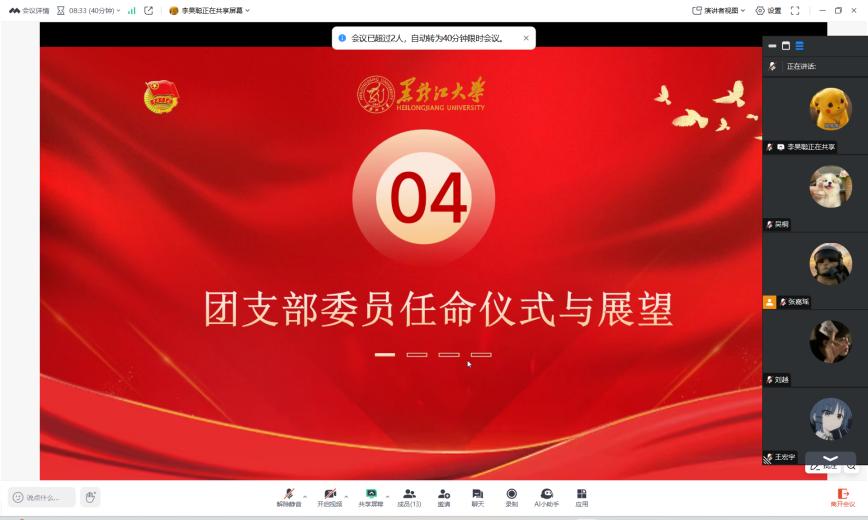 会议第四项,团支部委员任命仪式与展望。往届团支部书记吴桐寄语新一届团支部成员:“希望大家传承支部优良作风,以更饱满的热情服务同学、凝聚青年,在新的任期里让团支部工作更具活力与温度。”