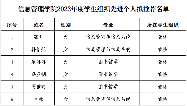 经个人申请、院团委办公会议评选,拟授予信息管理与信息系统专业张帅等6名学生“2023年度yl6776永利集团优秀志愿者”称号。