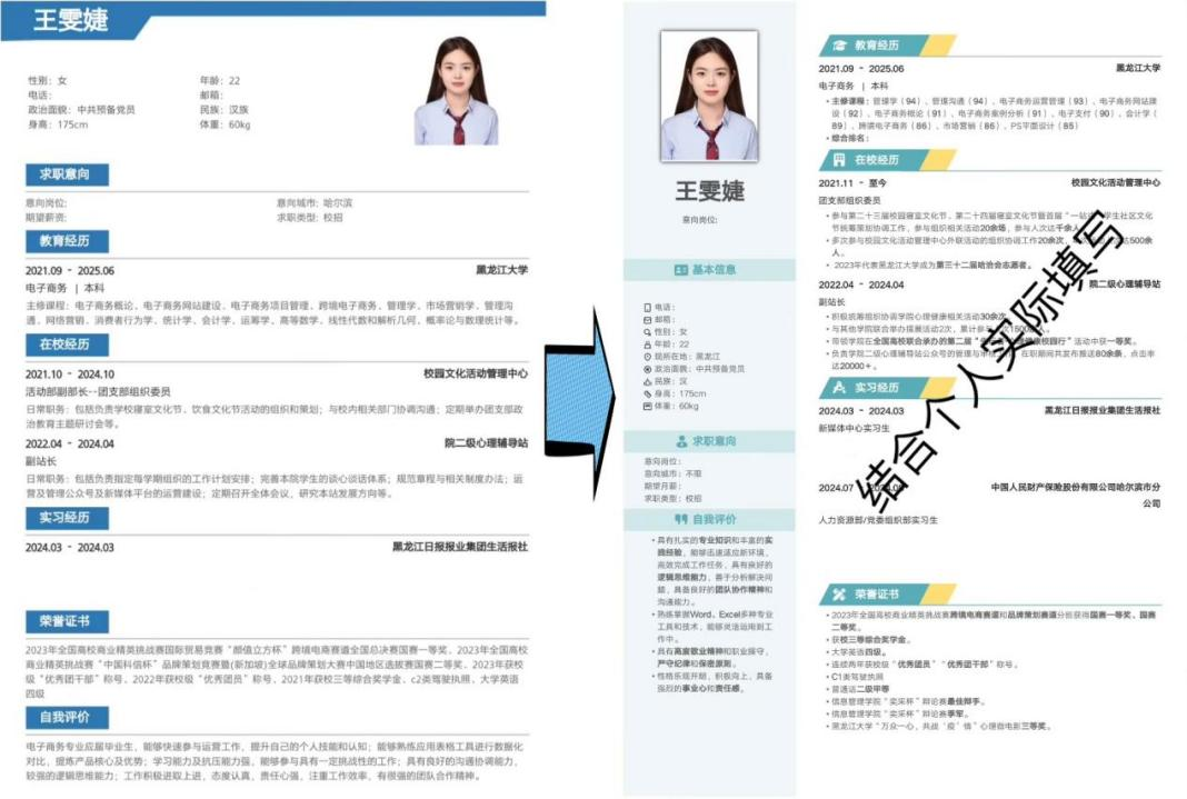 在大学期间,保持成绩的同时我参加了院校两级的学生组织,积极参与志愿服务与校园活动,这些经历让我收获的不仅有志同道合的朋友,还有不断提升的自我能力。在一次次的活动中,我的组织协调能力和语言表达能力都在不知不觉中逐渐提升。另外,参加学术竞赛也非常重要,这是专业能力最好的证明。也许为了比赛努力很长时间,最后在简历上呈现的不过寥寥数字,但它真的很耀眼。最后,我们要注重实习经历,实习是连接校园与职场的桥梁,通过实习能够深入了解行业运作,积累实践经验,转变学生思维,为求职打下坚实的基础。