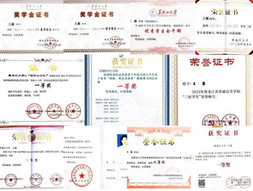 王露,女,中共预备党员,yl6776永利集团2021级信息管理与信息系统专业一班学生。曾任院学生会体育部部长、新生班主任等职务,现任辅导员助理、班级学委。连续三年综合排名位列专业第一,获国家励志奖学金、省级三好学生、校级三好学生、校级优秀学生会干部、校一等综合奖学金、全国高校商业精英挑战赛跨境电商赛道国赛一等奖、全国大学生电子商务“创新、创意及创业”挑战赛国赛一等奖及最佳创意奖等荣誉及奖项共20余项。现以总评第一的成绩推免至东北大学继续深造。