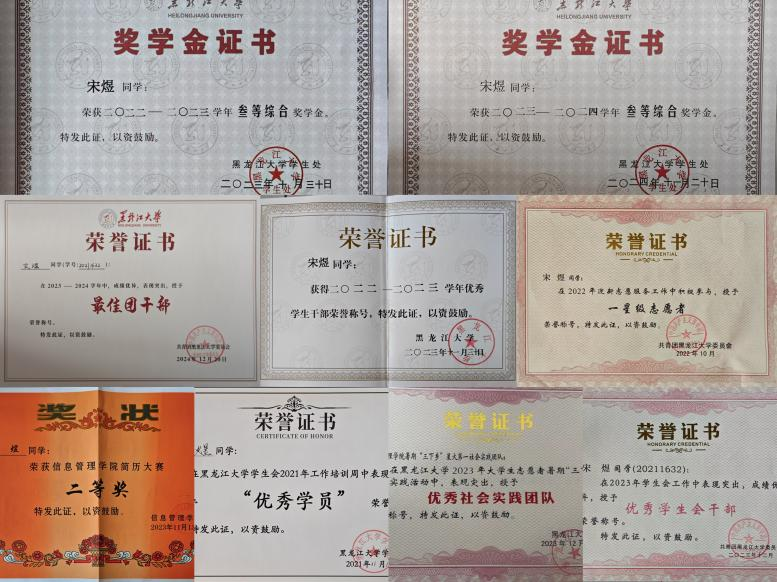 学海泛舟,砥砺奋进。宋煜同学始终秉持着对知识的敬畏之心,将学业作为大学生活的核心任务。在课堂上,她全神贯注,紧跟教师的教学思路,积极参与课堂讨论,高质量地完成各项课堂任务,赢得了授课教师的一致认可。凭借在学业上的突出表现,以及在品德修养、团队协作等方面的优秀品质,她多次荣获校级三等奖学金,还先后被授予 “优秀学生干部”“最佳团干部” 等荣誉称号。这些荣誉不仅是对过往努力的高度肯定,更是激励她在学术道路上不断攀登、追求卓越的强大动力。