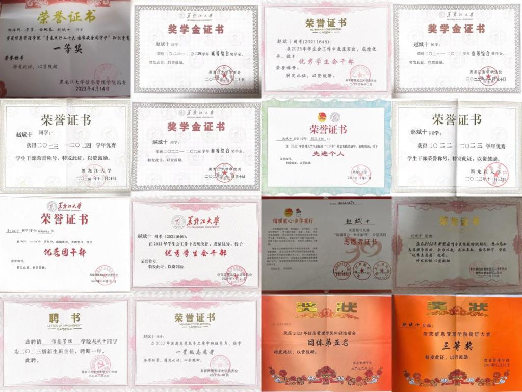 勇担职业,矢志创新。作为一名学生干部,无论是作为学生会主席、班级班长、新生班主任,赵斌十同学始终秉承着全新全意为同学服务的宗旨。在担任学生会主席期间,负责学生会的全面工作,定期召开各项会议,跟进各项活动的流程,累计策划筹办校园活动大大小小数10场,撰写推送文稿100余篇,审核推送600余篇,连续两年获优秀学生会干部荣誉称号,并带领学生会获优秀学生会荣誉称号,在学生工作中贡献青春力量。
