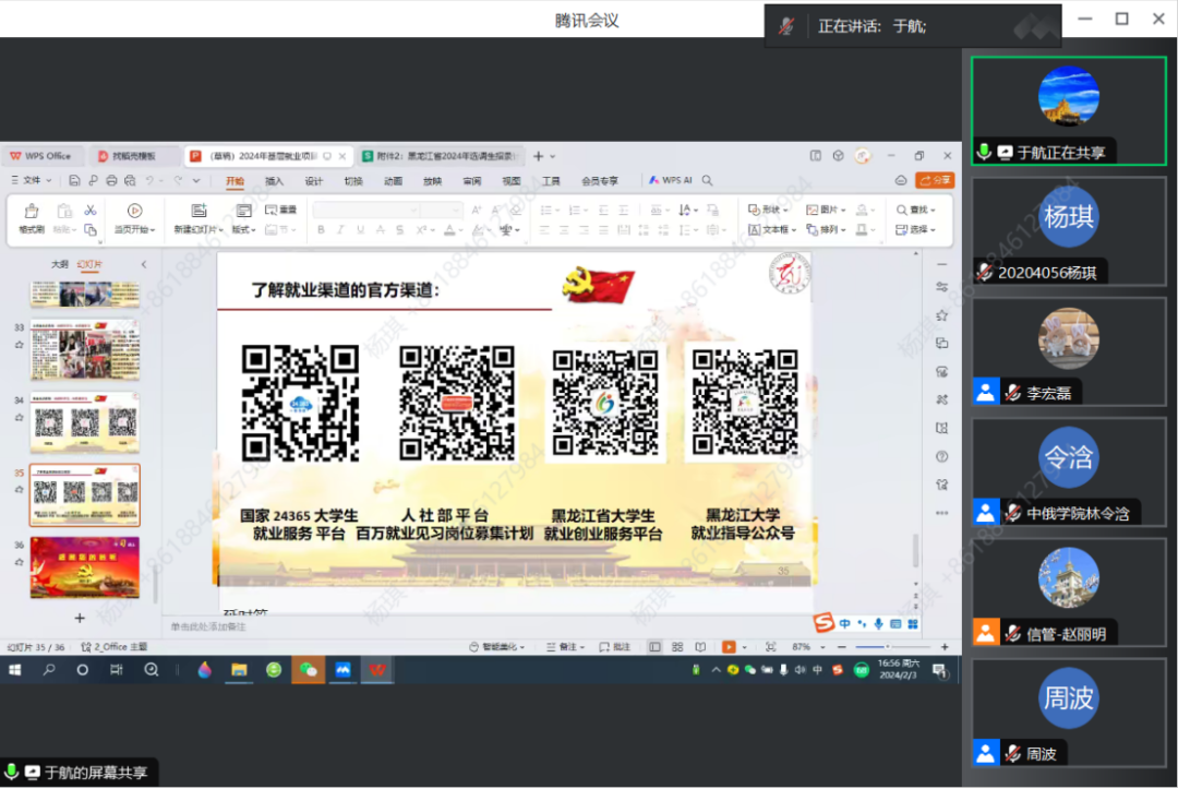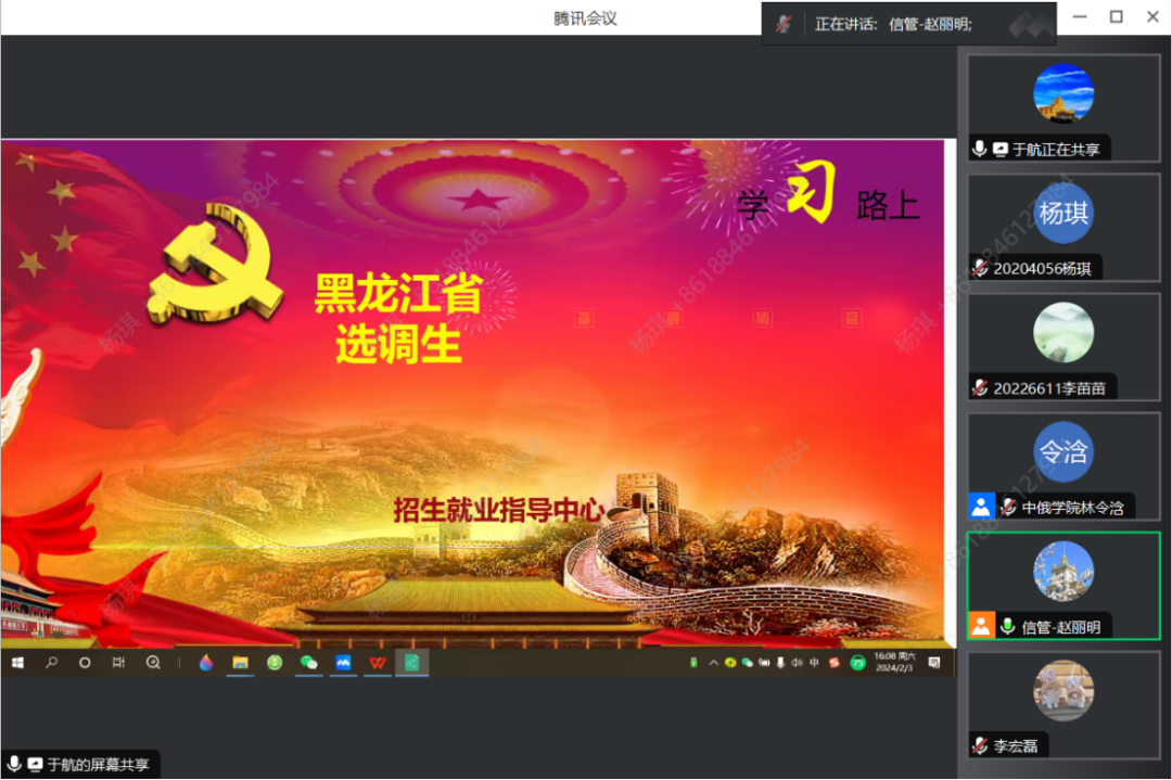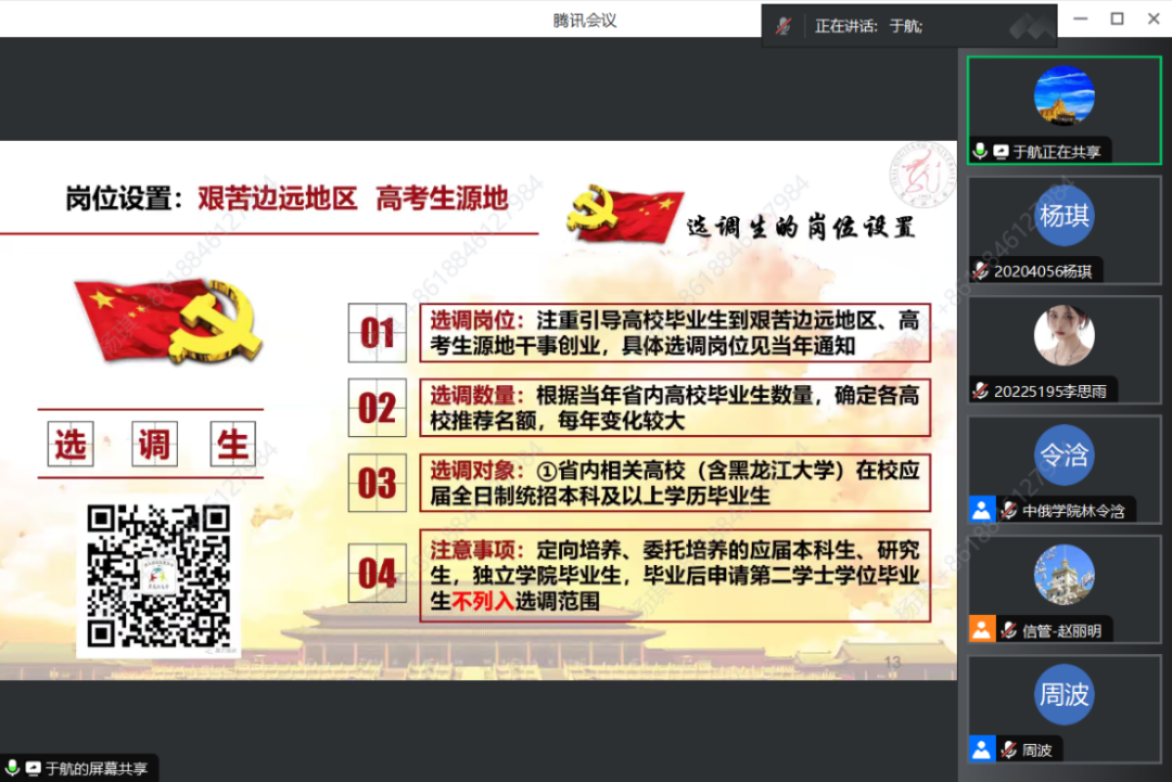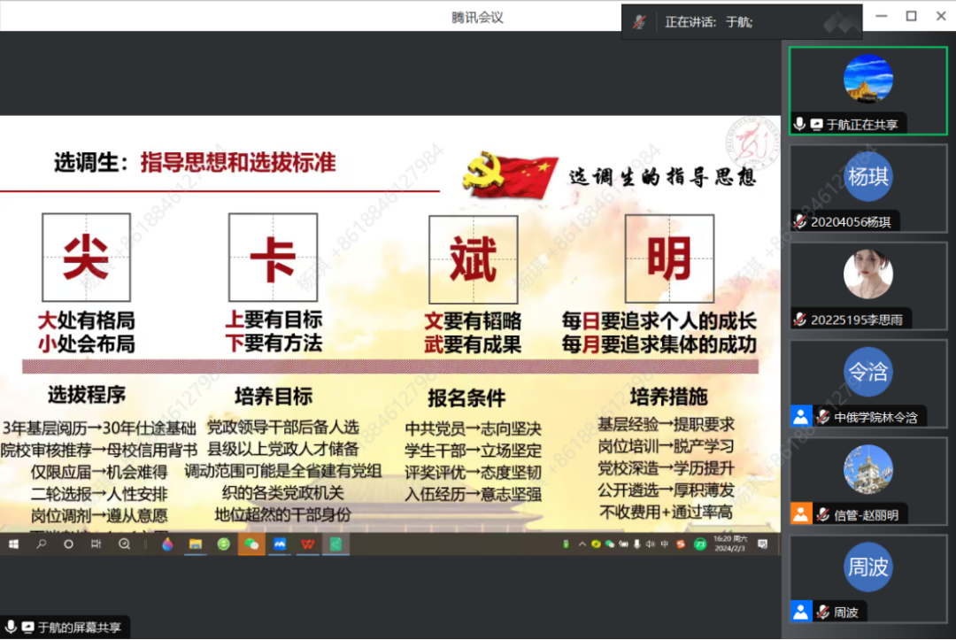 为进一步开展2024届毕业生就业工作,加强毕业生对选调生的认知,明确相关政策和具体要求,全力促进毕业生高效充分就业。yl6776永利集团联合中俄学院,于2024年2月3日16:00在腾讯会议开展2024年选调生政策解读讲座。本次讲座由永利官网招生就业指导中心就业指导部主任于航老师主讲,yl6776永利集团党委副书记赵丽明老师主持,中俄学院党总支副书记周波老师、yl6776永利集团与中俄学院全体辅导员老师、2024届本硕毕业生和部分低年级学生共同参会。