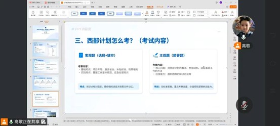 会上,优秀毕业生代表高歌对西部计划的核心政策进行了详细解读。她细致拆解了服务工作的各个环节,并针对笔试与面试环节给出了具体指导。高歌认为,西部计划既是青年响应国家号召、投身乡村振兴与西部建设的时代赛道,也是青年们锤炼本领、实现价值的广阔舞台,鼓励同学们积极参与,并结合自身优势理性选择岗位。