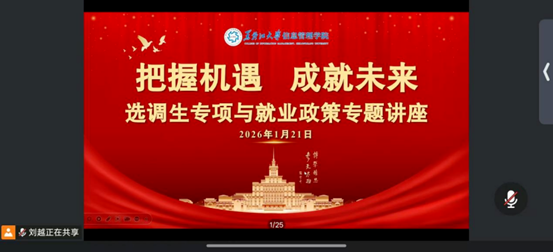 明晰政策,方能稳健前行。本次会议紧密围绕毕业生求职与择业现实需求,让2026届毕业生深入理解了选调生政策,并激发了学生投身基层的责任感与使命感,为即将开启的职业之路注入坚实的信心与动力。