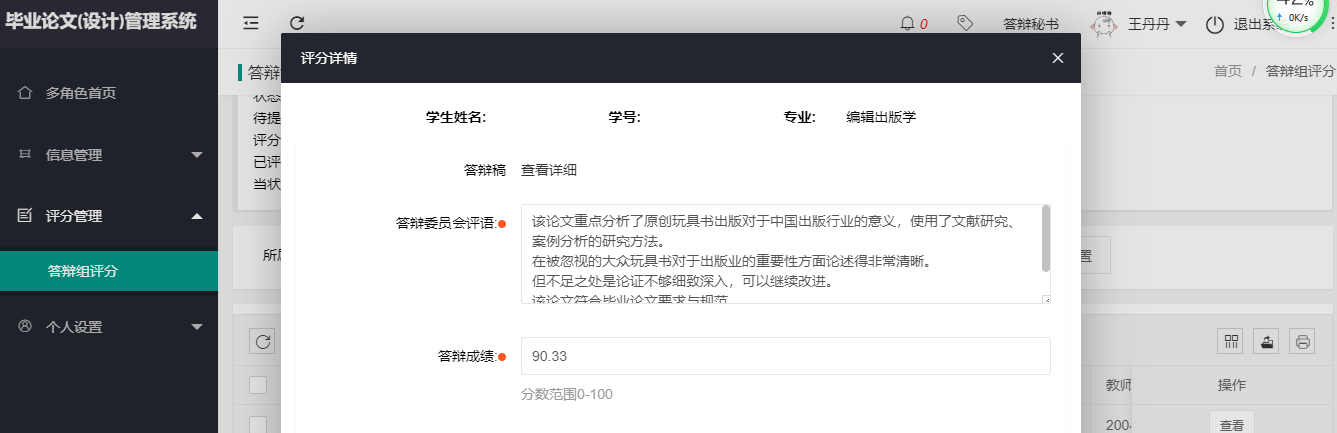 从2020年5月22日开始,各专业的答辩工作陆续开始,由于部分专业教师人数较少,所以只能分为一组,对专业所有学生进行答辩,工作量是非常大的,为了能够提高效率,学生的指导教师在该学生答辩过程中,虽然不参与答辩评审,但却充当了答辩秘书的角色,利用有限的时间完成答辩过程记录工作和答辩小组成员分数登录与核算工作。