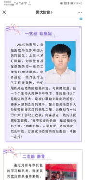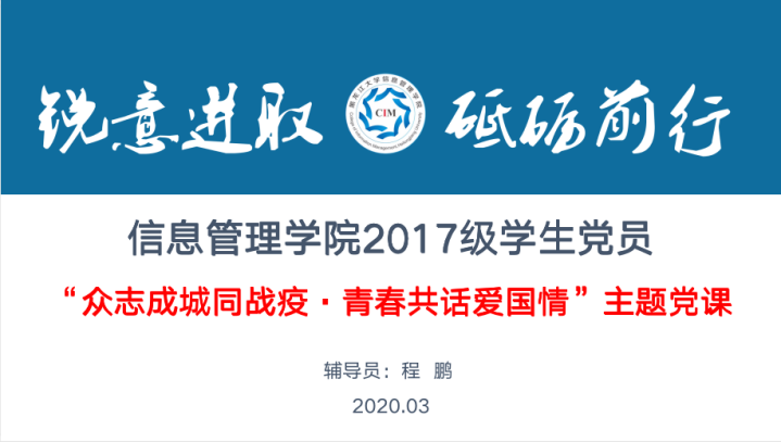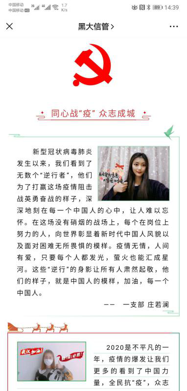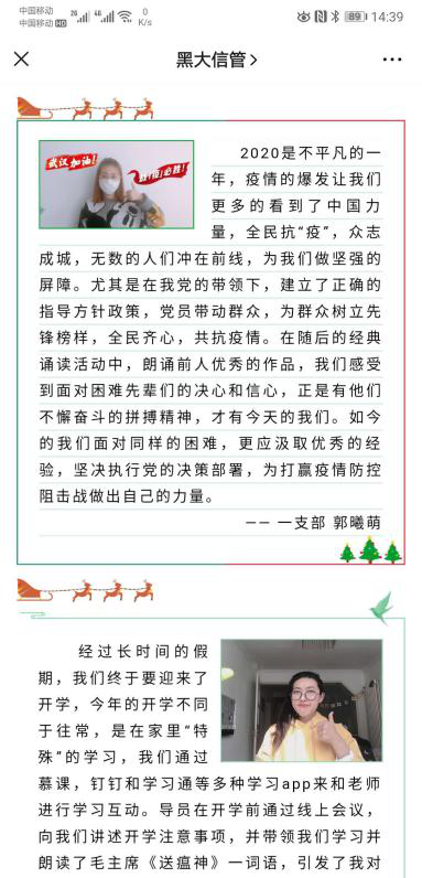学院自3月8日起,辅导员和学生党支部书记分别通过线上平台组织学生党员上一堂“云党课”,带领学生党员集体进行经典诵读,并将学生党员对党课和经典诵读内容的感悟在学院微信公众平台“黑大信管”进行同步宣传和展示。云党课以“众志成城同战疫·青春共话爱国情”为主题,带领全体党员同学深入了解疫情下党和国家的作为,走近一线奋斗者,了解在疫情下从个人到组织的付出与担当。