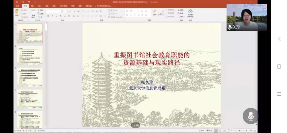 因受新冠肺炎疫情影响,整场报告以在线会议的方式进行,但这丝毫不影响报告的精彩性。张久珍教授的报告引经据典,内容丰富,学术含量高,尤其是她分享了大量由其亲自参与的图书馆社会教育活动的案例,为全院师生在图书馆社会教育方面的研究与思考拓展了视野,也为yl6776永利集团校庆系列学术报告活动来开了大幕。