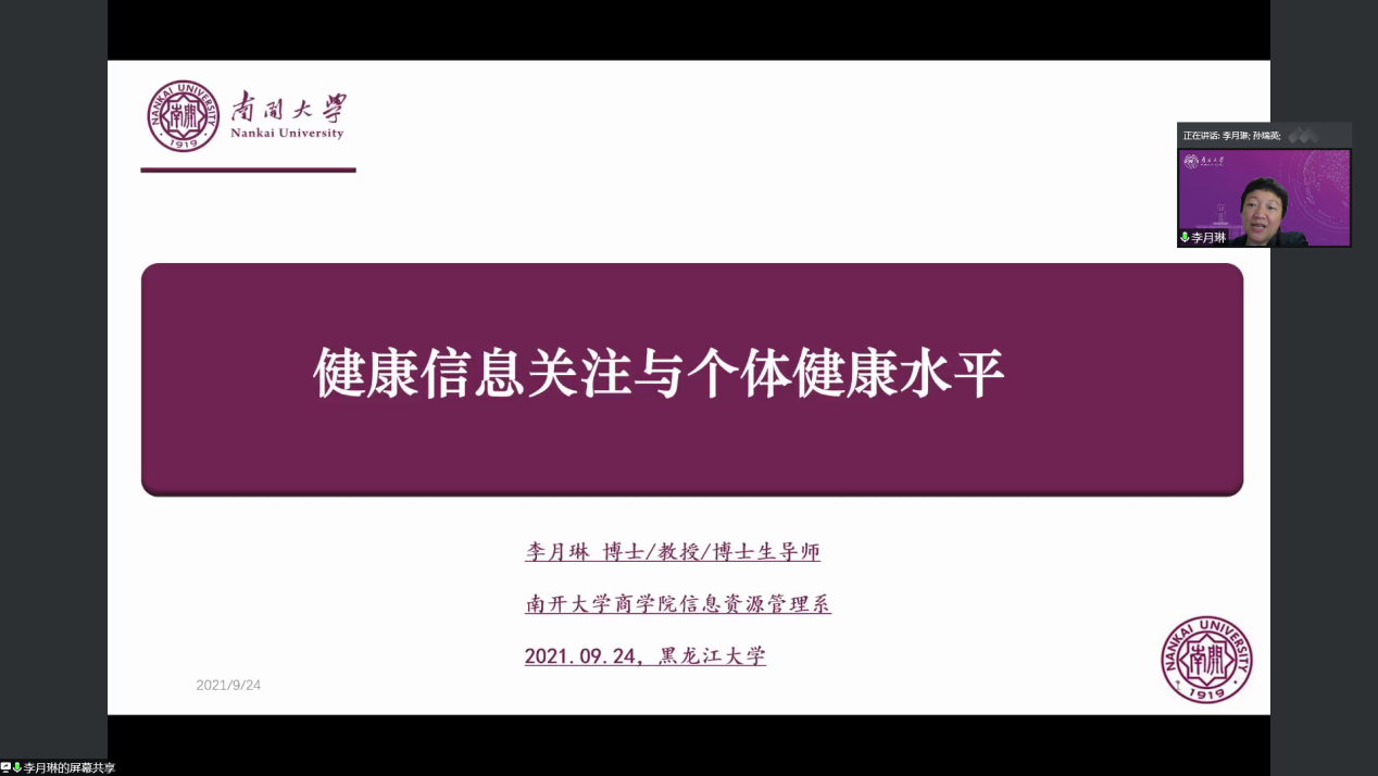 李月琳教授此次报告的题目为“健康信息关注与个体健康水平”。报告共分为三个部分,首先李教授详细介绍了公民对健康信息关注的背景,从两个案例着手,一方面对天津市某高校大学生社交媒体健康信息行为的调研,对调研对象的伪健康信息识别能力与健康信息获取行为进行了较为详细的分析;另一方面对不同地区中老年人的健康信息甄别能力进行了调研,归纳总结了不同群体对健康信息关注度及影响关注度的变量。其次,报告阐述了健康信息素养的内涵及国内外研究现状,提出用户健康信息素养水平整体不高,年龄差距显著。最后报告指出健康感知能力在健康信息关注度对个人健康水平正向影响作用的中介效应明显。提出提高网络用户健康信息关注度能提高用户健康感知能力、提高网络用户健康信息关注度能提升个人健康水平、健康信息关注度以健康感知能力为中介来提升个人健康水平。