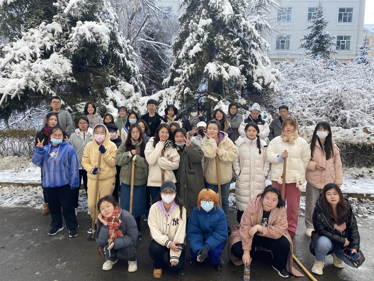 在这次清雪活动中,同学们的感情在劳动中升温,尽管天冷、路滑,大家一直没有离开清雪现场,从扫雪初一直坚持到扫雪净为止,充分体现了成员们的强烈责任感以及团队精神。所有人心往一处想,劲往一处使,在大家不断的努力下,终于完成了工作,为全校师生清扫出一条干净的道路。