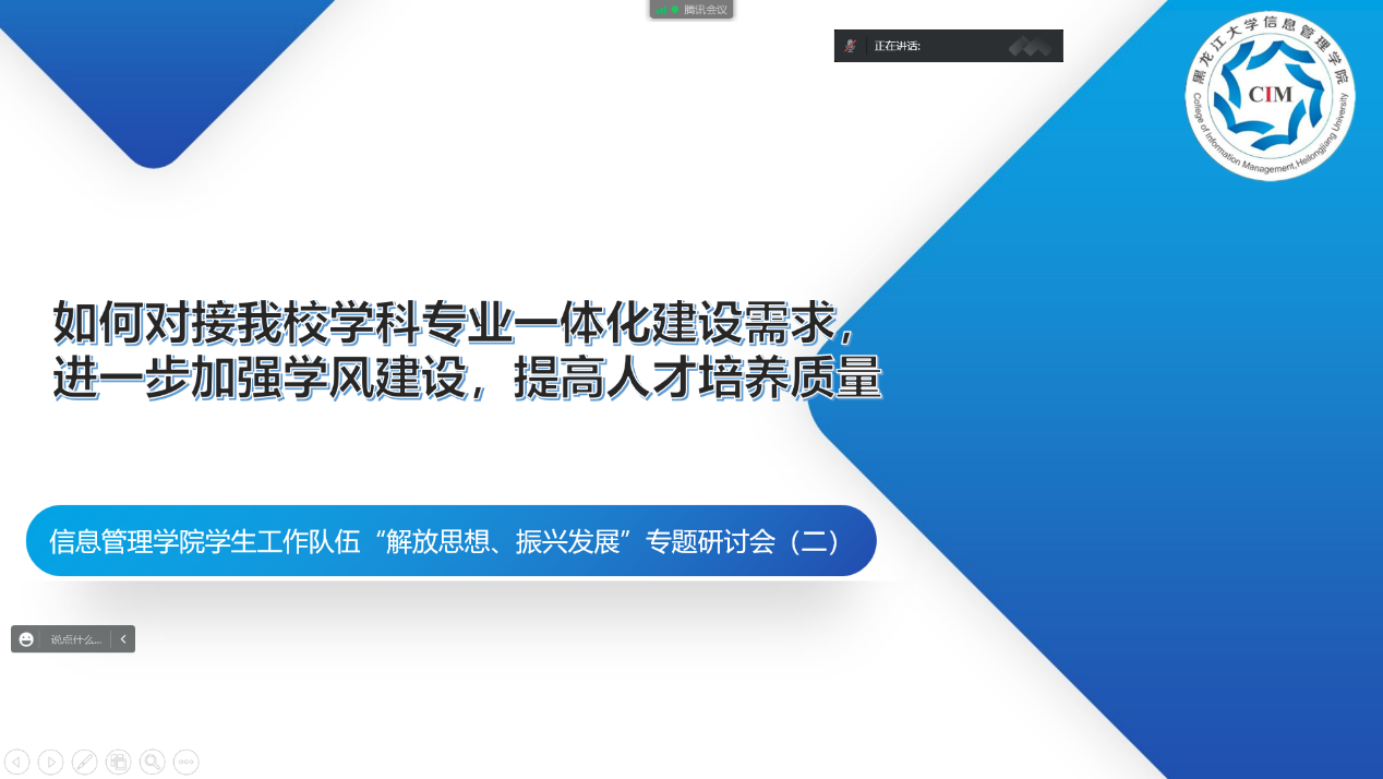 本次研讨的主题为“如何对接我校学科专业一体化建设需求,进一步加强学风建设,提高人才培养质量”。马海群老师指出,学风建设是高校人才培养的关键,要充分发挥学生工作队伍在学院学风建设中的积极作用。结合实际,讲求实效,把工作做新、做细、做活,巩固学风建设取得的成果,切实推动学校学科专业一体化建设需求,提高人才培养质量。