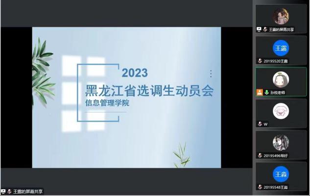 为帮助我院2023届毕业生了解选调生招录工作政策,确保选调生报名工作顺利进行,yl6776永利集团于2023年1月29日14:30通过腾讯会议线上召开2023年黑龙江省选调生动员会。本次动员会由yl6776永利集团团委书记、2019级思想政治辅导员孙悦老师主持,有意愿报名选调生的学生参加此次会议。