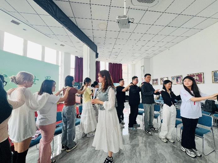 随后,王硕老师带领同学们进行了热身活动。同学们围成一个圈,根据王硕老师的指令在前方同学的背后用手模仿天气状况,迅速打破了成员之间的陌生感,营造了轻松愉快的氛围。