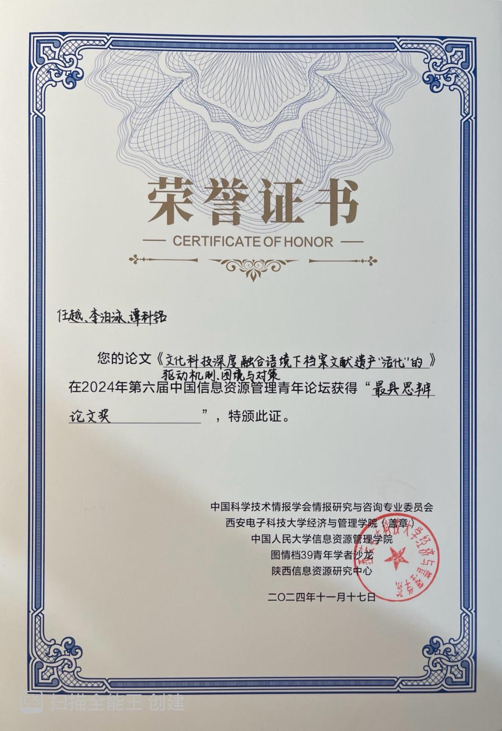 11月16日,任越教授在青年主旨报告与学术脱口秀环节担任主持人,谭科铭同学在海报展示环节进行现场汇报展示。17日,任越教授参加中国科技情报工作专委会会议,并围绕档案智库建设进展进行了汇报,王瀚功和李泊泳两位同学在各自分论坛进行PPT报告展示。大会闭幕式环节,任越教授与硕士生李泊泳、谭科铭合作的论文获2024年第六届中国信息资源管理青年论坛“最具思辨论文奖”,并获得多家专业期刊的录用。
