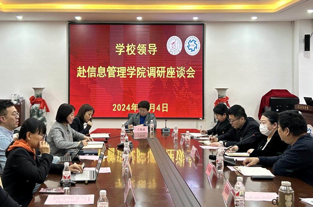 院长黄丽霞向王敬波校长介绍了学院基本情况,围绕学科建设、人才队伍、专业与学位点建设、涉外工作进展情况进行了汇报。副院长任越介绍了学院在研究生培养、科学研究与学科建设等方面取得的成绩。副院长周丽霞围绕学院本科专业建设、教师能力提升、双学位专业进展等方面进行了汇报。系主任徐海静、赵丽梅、刘春艳和刘甲学围绕专业人才培养、实验室建设、课程培育等方面分别介绍了各系的情况,表达了专业发展所面临的困难及今后高质量发展诉求。管理科学与工程学科带头人张涛针对本人及其科研团队面向学校职能部门与涉俄研究开展的工作进行了介绍,青年教师邹纯龙从青年人才引进与学校人才政策方面提出了建议。学科带头人马海群从强团队、创平台、塑智库与促学科四个方面汇报了信息资源管理学科助力学校各学科与我省现代产业体系的融合点及对俄办学、响应国家重大战略所做的工作。