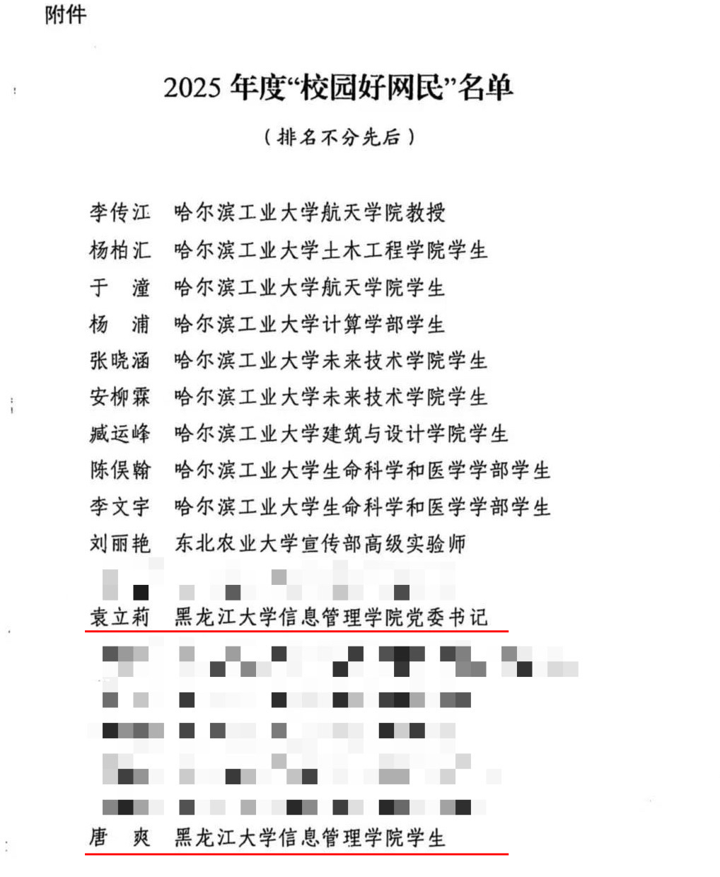 在2025年度全省高校"龙江高校好网民"评选中,袁立莉老师与2024级图书情报专业研究生唐爽同学同时荣获此项殊荣。两位师生长期致力于"龙江高校大讲堂""黑土地上的精神力量""龙江高校英烈故事云端宣讲"等系列网络思政品牌活动的策划与组织工作,为营造积极向上、健康有序的高校网络生态作出了积极贡献。