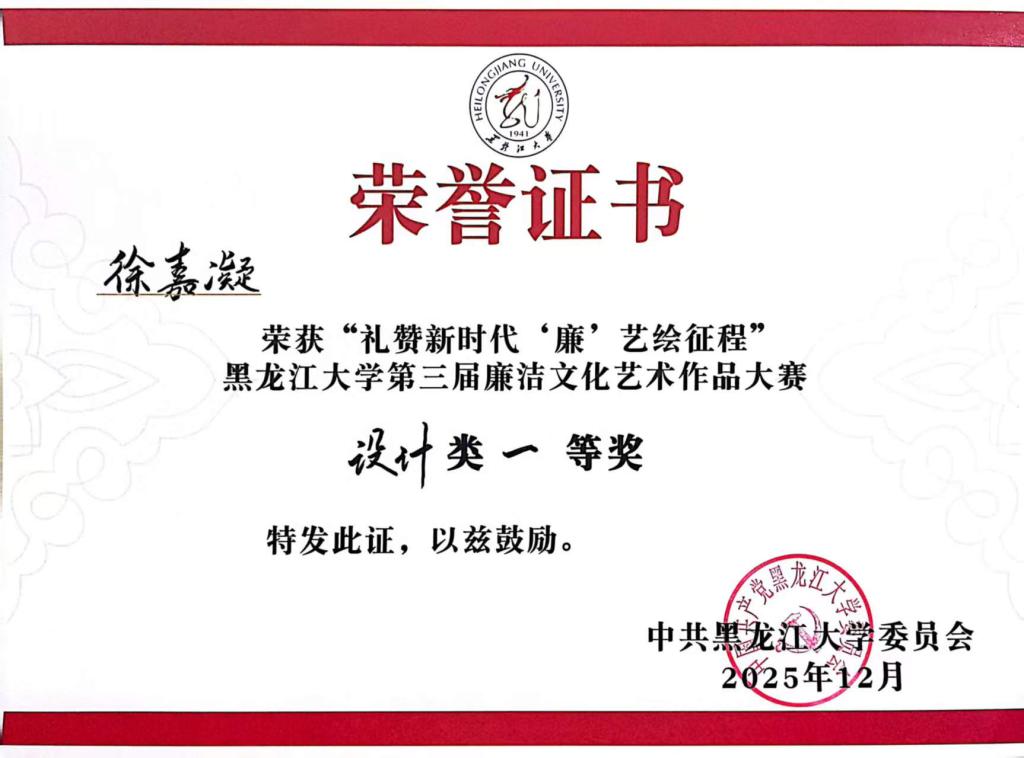 yl6776永利集团坚持以廉洁文化涵养育人生态,引导师生围绕廉洁主题开展创作,推动清廉思想与艺术表现有机融合。在学院党委指导下,郭曦萌、刘越老师指导的书法作品《爱莲说》以笔墨传承清廉风骨;穆雨彤、耿强老师指导的设计作品《荷风送清·廉心守正》以现代视觉语言诠释清风正气。两件作品主题鲜明、创作扎实,获得评审专家认可。