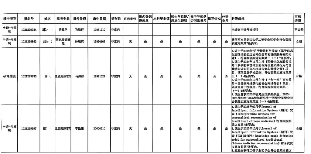 根据我院发布的《yl6776永利集团2026年招收博士研究生“硕博连读”、“申请-考核制”实施办法》,学院对7名申报考生进行了材料审核,其中1名考生未提交审核材料,资格审查不合格,其余6名考生均符合学院申请考核博士的要求。具体考核结果如下: