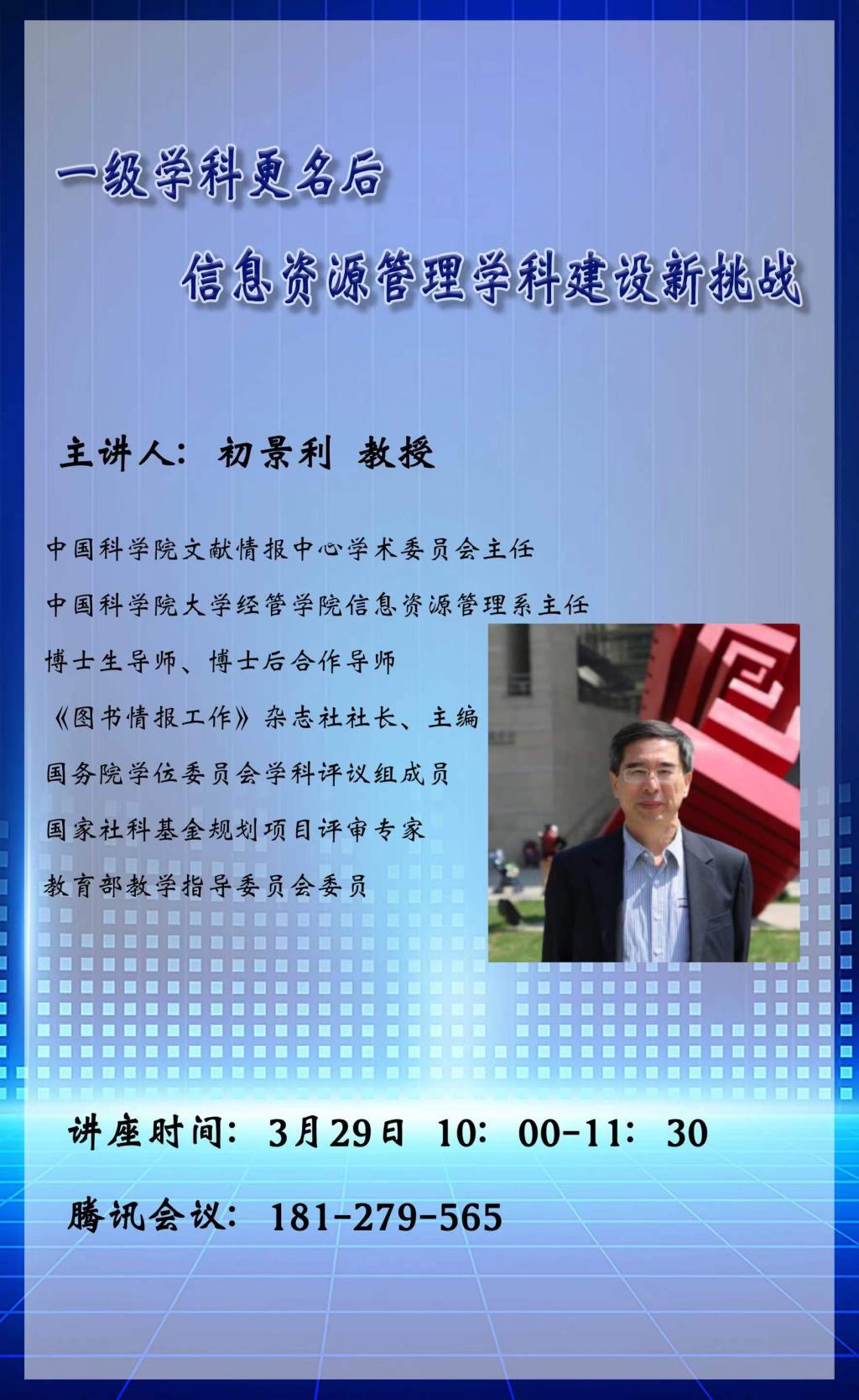 主讲人: 中国科学院文献情报中心 初景利教授主题:一级学科更名后信息资源管理学科建设新挑战时间:2023年3月29日 10:00-11:00腾讯会议:181-279-565