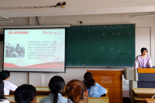 活动伊始,学生党支部书记王文静同学为全体党员讲述党史故事之入党誓词的由来。她声情并茂的讲述了入党誓词从何而来,经历了怎样的曲折发展才形成并沿用至今。全体党员在入党誓词形成过程的故事中体会中国共产党奋斗的艰难历程,深刻领会到几经变迁与发展,始终不变的是中国共产党人的初心和使命。明确入党誓词是党的宝贵精神财富,是中国共产党人不竭的精神动力。
