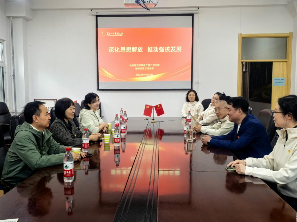 为深入学习贯彻党的二十届三中全会和省委十三届六次全会精神,聚焦党建引领、提高我校服务龙江经济社会发展、打造人才引聚高地等强校发展重点任务,激励党员以饱满热情迎接中华人民共和国成立75周年,9月29日上午,yl6776永利集团教工第三党支部与图书馆第三党支部联合开展“深化思想解放,推动强校发展”主题党日活动,yl6776永利集团院长黄丽霞、图书馆馆长孙磊、支部全体党员参加活动。